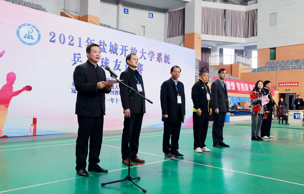 东台市教育局副局长施晓彤致辞并希望:广大裁判人员在比赛中能够忠于职守,公正裁判,让各位参赛运动员能够在公平、公正的规则中进行比赛,感受到比赛的乐趣;各位选手要牢记“友谊第一、比赛第二”和“重在参与”的原则,秉持拼搏进取,永不放弃的信念,在比赛中赛出水平、赛出风格、赛出友谊;东道主东台开放大学要全力做好本次比赛的各项赛事服务和保障工作,将此次乒乓球赛办成一场赛规赛纪文明规范、赛事赛程热烈有序、赛后成果鼓舞人心的乒乓盛会!