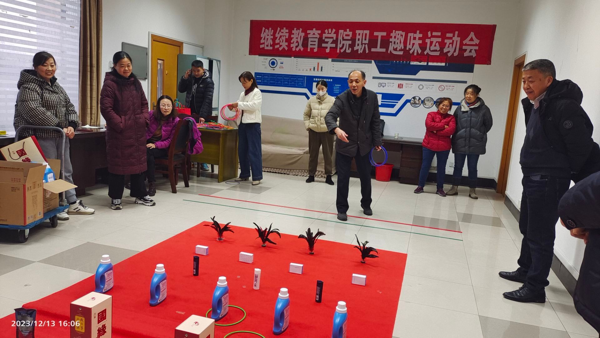 12月13日下午,公司分工会在北校区图书馆404室举办教职工趣味运动会,全体职工参加。趣味运动会设置了套圈游戏项目,每人6个圈,站在规定线外套到奖品,登记后即可领取。活动现场十分热闹,欢声笑语不断。