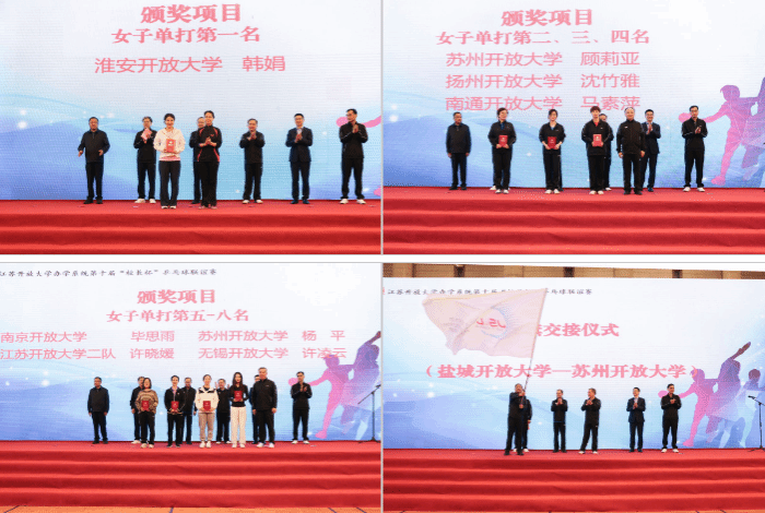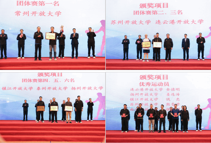 经过一天紧张的比赛,最终常州开放大学、苏州开放大学、连云港开放大学、镇江开放大学、泰州开放大学、扬州开放大学分获团体前六名,淮安开放大学韩娟等8人获女子单打前八名,连云港开放大学金德明等5人获得优秀运动员称号。
