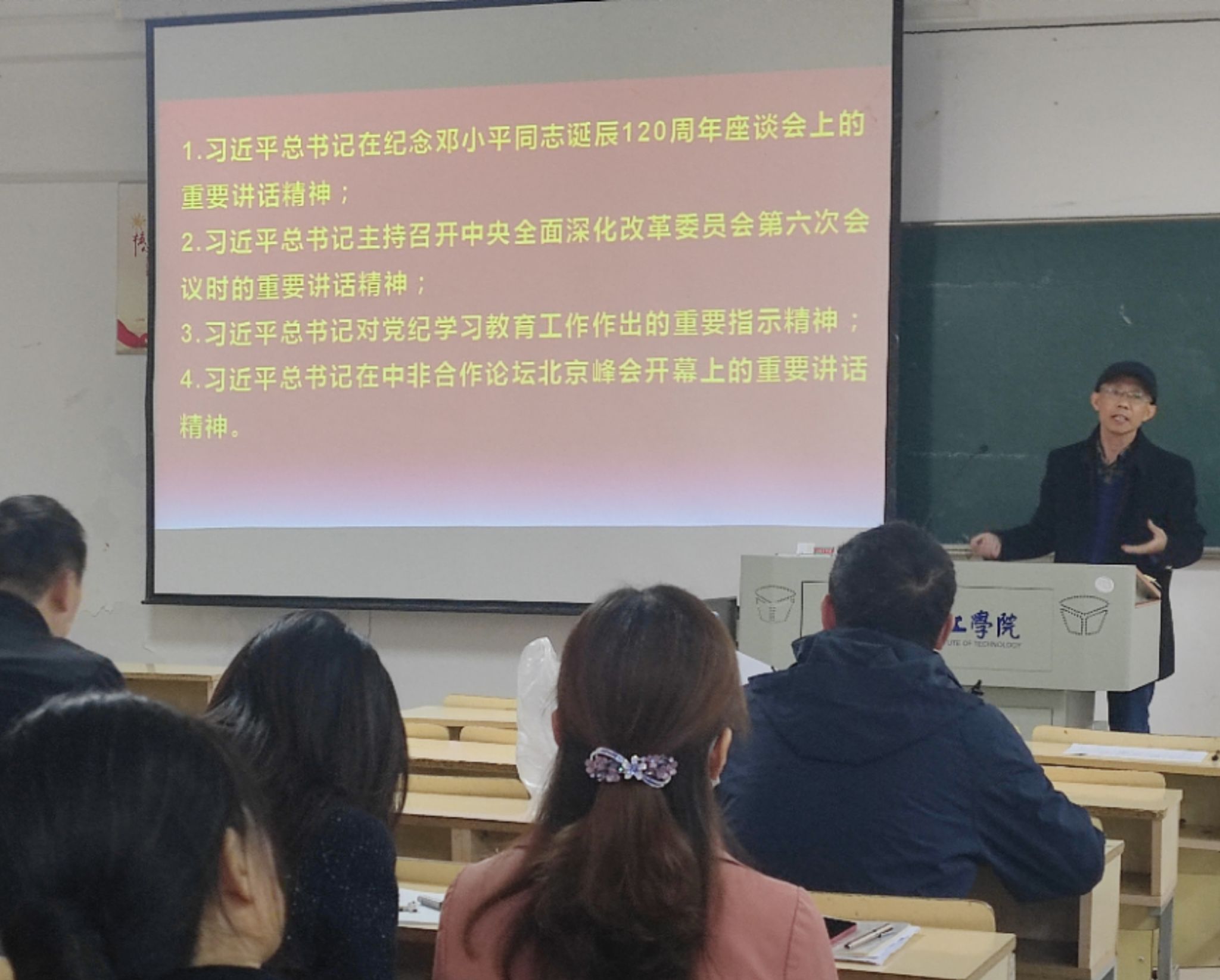 教工党支部书记韦文东领学了习近平总书记在纪念邓小平同志诞辰120周年座谈会上的重要讲话精神、习近平总书记主持召开中央全面深化改革委员会第六次会议时的重要讲话精神、习近平总书记对党纪学习教育工作作出的重要指示精神和习近平总书记在中非合作论坛北京峰会开幕上的重要讲话精神。