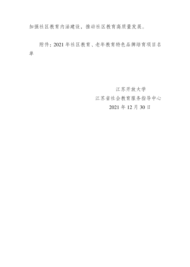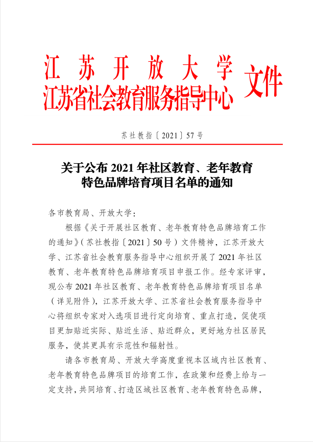 关于公布2021年社区教育、老年教育特色品牌培育项目名单的通知