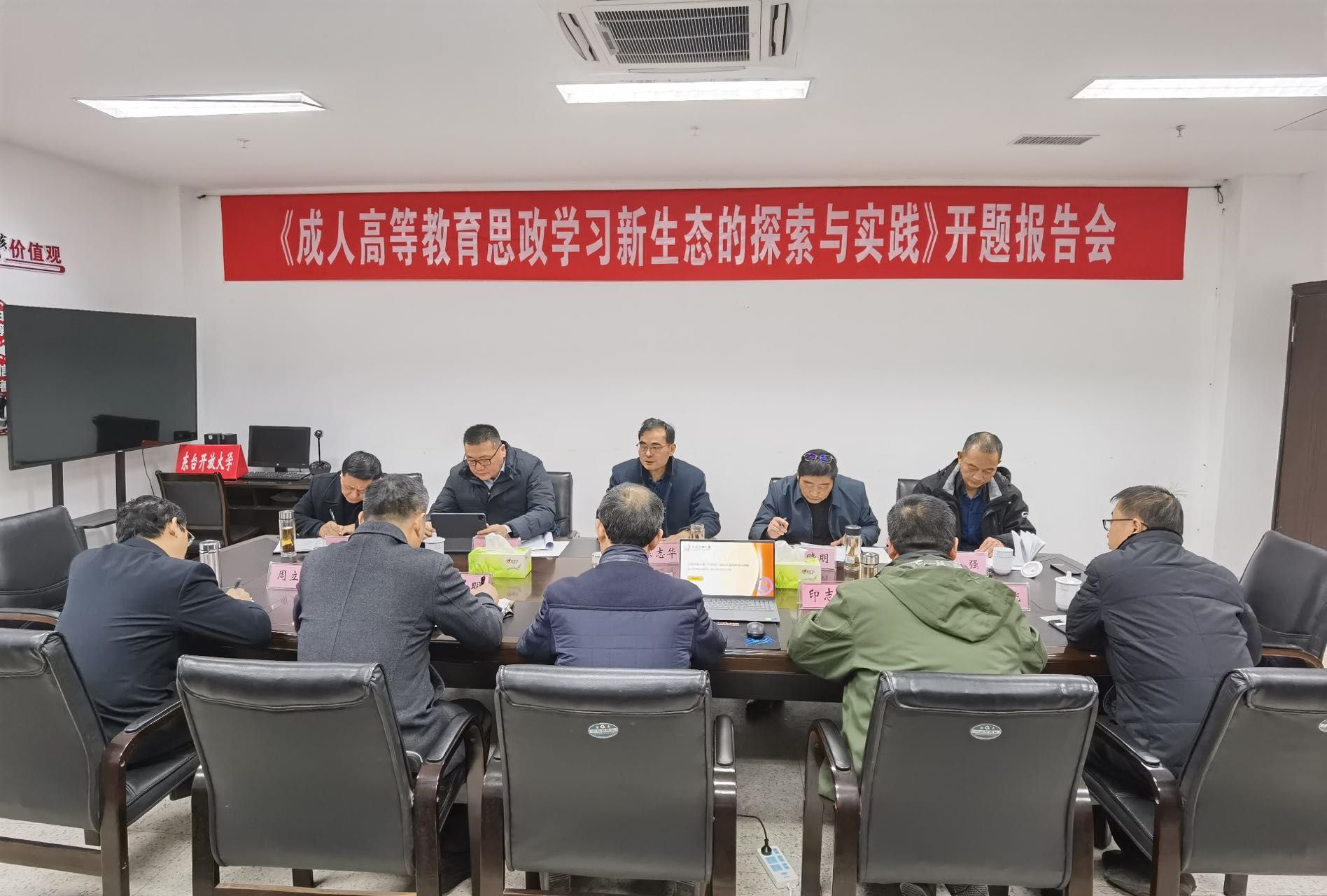 12月2日下午,2022年度PlayAce游戏平台“十四五”科研规划课题《成人高等教育思政学习新生态的探索与实践》进行了开题答辩。本课题由东台开放大学承担。PlayAce官方网站党总支书记、董事长陈志华任开题答辩专家组组长。盐城市教育局职业教育与社会教育处处长孙晓明任答辩专家并讲话。课题负责人东台开放大学董事长虞静东做课题答辩陈述。