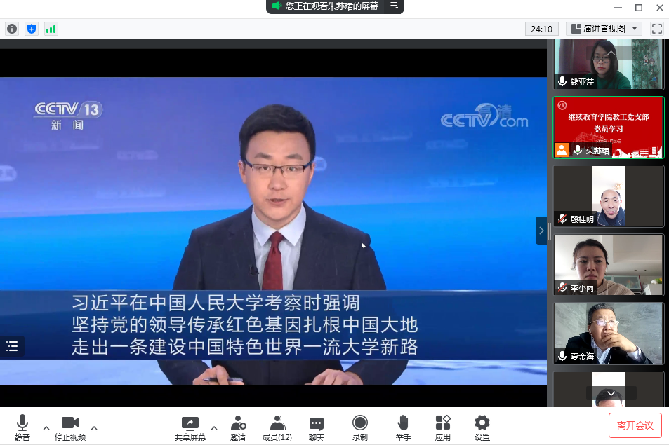 大家一起观看了习近平总书记视察中国人民大学重要讲话精神的视频报道。招生办副主任韦文东领学了《高等学历继续教育校外教学点设置与管理办法》,并与旧办法作了比较。函授部、在职研究生部殷桂明主任就学习内容谈了自己的感受,他认为习近平总书记这次视察的讲话精神,充分体现了对“为谁培养人、培养什么人、怎样培养人”这个教育根本问题的高度重视。党政办主任钱亚芹作了题为《习近平总书记考察中国人民大学,重点强调了什么?》的重点发言,她认为习近平总书记考察中国人民大学的重要讲话,为我们落实立德树人根本任务,培养“听党话、跟党走”堪当民族复兴重任的时代新人,指明了方向、提供了遵循。